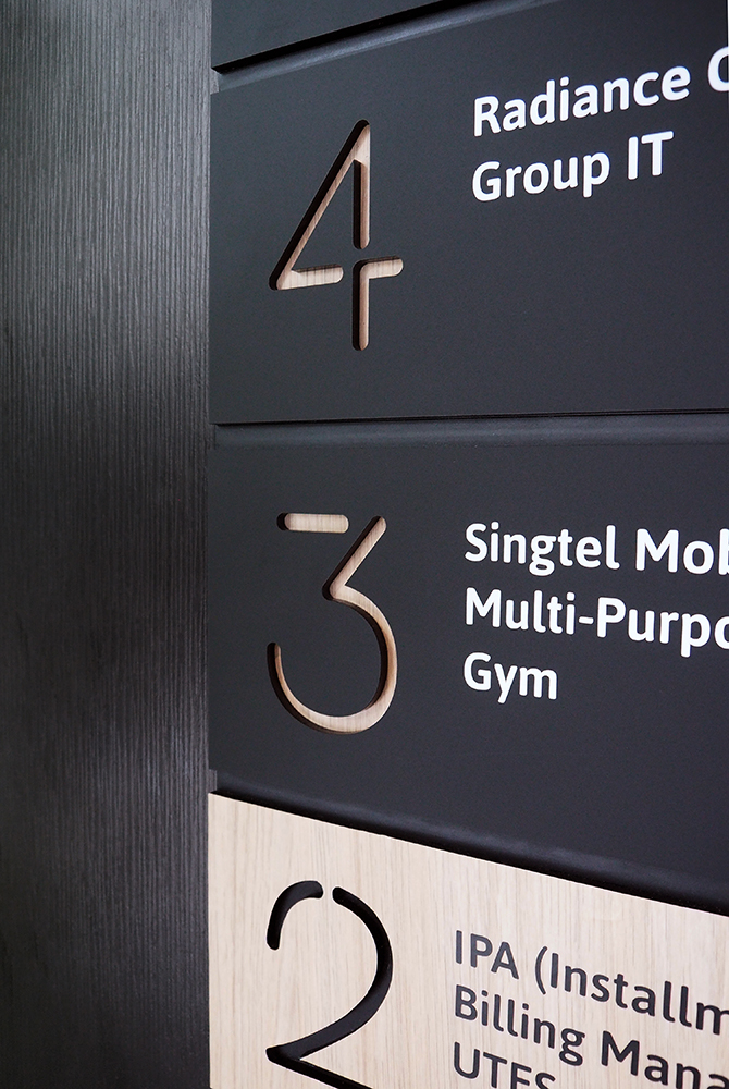 Singapore’s largest telco company has refurbished the Singtel Payment Centre building to transform its work-and-play culture. The new interior features open-concept office spaces, cafes, project rooms and a gym, creating a trendier, friendlier working environment. NEIGHBOR has been appointed to develop a wayfinding and signage system in alignment with this transformation. Our minimalist solution employs eco-friendly building materials to reflect the colour scheme and utilises smart space design, angles, layers, contrast and composition to achieve a trendy yet sophisticated outcome.